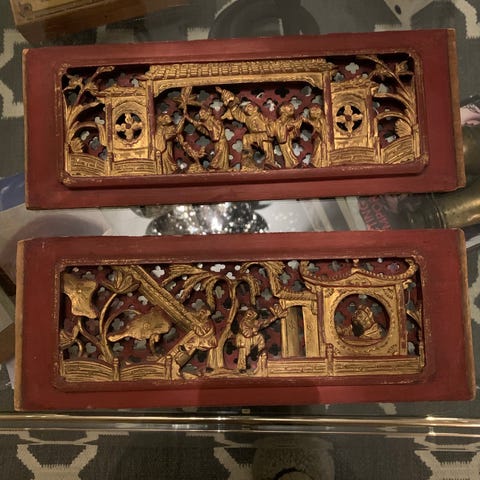 Smukt og dekorativt bladguld panel i træ, som kan hæges samlet eller med 2-3cm afstand som på photo. Mørk baggrund i kontrast til det gyldne mønster. Panelet er designet til at kunne hænges på væggen som en kunstnerisk udsmykning.