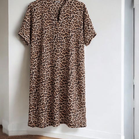 Fin kjole i beige og sort leopardprint med 3/4 lange ærmer.