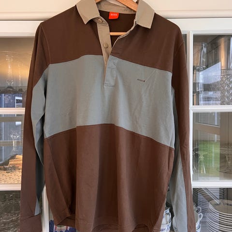 Har kun haft den på et par gange og den er vasket skånsomt. Standen er derfor næsten som ny bortset fra at logoet røg af under strygning (fire plastikbogstaver 'Boss').