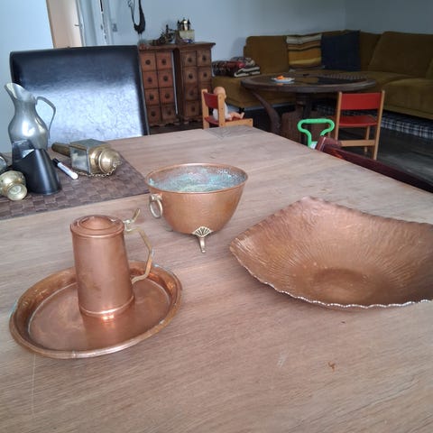 Antik kobberkulholder med porcelænshåndtag og løveornament