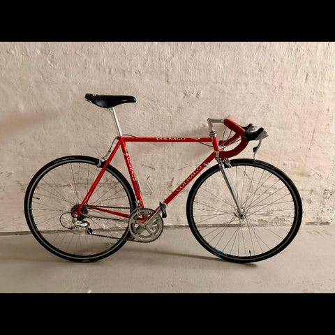 Lækker retroracer fra Gianni Sancineto, men fremstår med brugsspor. Har stået en del år på mit loftsrum. Krom-forløb ikke pæne. Enkelte afslag i stels flotte turkismetal lakering. Campagnolo Mirage bag (virker fint) og Campagnolo Record for (skal justeres for at gå på store klinge). Ligeledes Campagnolo-bremser for og bag. Cyklen er fra først i 90’erne. Der følger Campagnolo rytterpedaler med. Jeg er 182 og den passer godt til mig. Jeg tror den er størrelse 56, men er ikke ekspert på målemetoden :-)