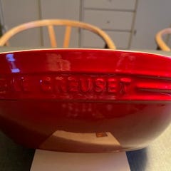 Flot Le Cruset skål til salater, kartofler mv. Ingen hakker el. Lign. 30 cm hvor den er længst.