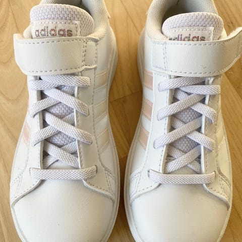Adidas børnesneakers i størrelse 35 til piger. Skoene er grå med lyserøde detaljer og har snørelukning. Materialet består af en kombination af tekstil og syntetiske materialer, velegnet til daglig brug.