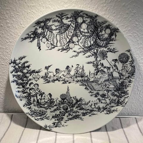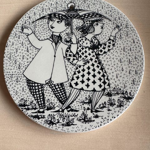 Bjørn Wiinblads kendte streg, her på to platter/smørebrikker med navnene “Sol” og “Maane”, lanceret i anledning af åbningen af en ny Inspitation-butik i Herning i 1978. Ø ca. 15 cm, og de står som nye. Samlet pris.
