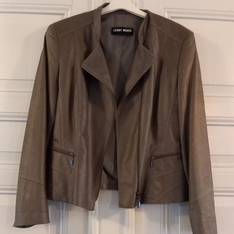 Gerry Weber jakke/blazer i størrelse 44 med et brystmål på cirka 108 cm og en længde på cirka 63 cm. Jakken er i en brun grund farve og har et mønstret design med detaljer i sort og beige. Den er lavet af et vævet materiale og er med dekorative sømme. Den er fremstillet af 50% jomfruuld, 30% viskose og 20% polyester, medens foret er 100% acetat. Billede 4 viser tydeligt kvaliteten i materialet. Lynlåsen er "kørt helt op" på billede 1 og 4, det vil sige de sidste cirka 14 cm er der ikke lynlås. Blusen medfølger ikke.