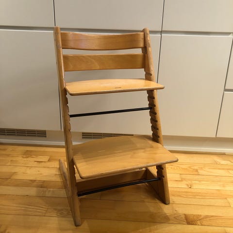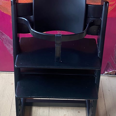 Trip trap Stokke højstol i sort træ. Designet til børn med justerbar sidde- og fodplade for optimal komfort og støtte. Robust konstruktion med fokus på funktionalitet og holdbarhed.