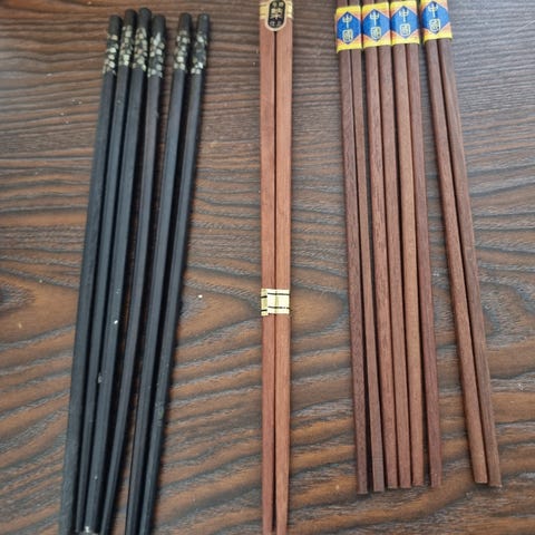 Bestik, 4 spisepinde, Boligrafo, 4 spisepinde med kinesiske billeder i toppen. Den ene har mistet noget af den røde farve for neden. Derfor den billige pris.