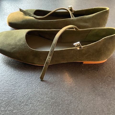 Aldrig brugt. Har fået nogle pletter på siden af den ene sko. Ved ikke hvordan, måske har de stået tæt op af nogle sorte sko på sko reolen.