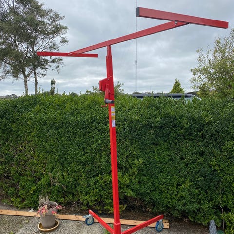 Håndtagsløfteblok med wire, løftekapacitet enkeltreb 500kg, dobbeltreb 1000kg. Løftehøjde enkelt reb 9m, dobbelt reb 4,5m. Vægt 6,3 kg. Håndarm mangler, men det bør være muligt at sætte en på.