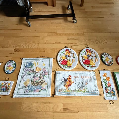 To broderier med motiv af påskekyllinger og forskellige blomster. Broderierne er udført på hvidt stof med farvet tråd og monteret i runde trælignende rammer der dog er af gummi.