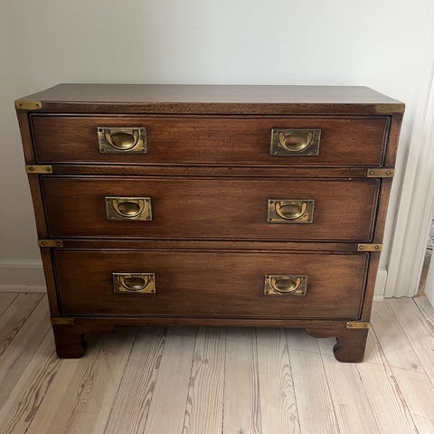 Antik Military kommode med låg og org nøgle, fremstillet i mahogni med messing beslag . Kassen står på fire ben og har en aftagelig bakke indvendigt. Velegnet til opbevaring af småting og dekorativ brug, eller som lampebord/sengebord. 65 x 45 x 34 cm