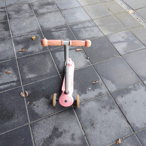 Globber løbehjul med tre hjul, designet til børn. Den har et justerbart styr for tilpasning til barnets højde og tre hjul for stabilitet. Egnet til udendørs brug for børn.