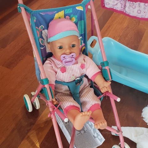 Paulina dukke som kan sige forskellige ting. Der medfølger også bleer, tøj, kørepose og ekstra pude/dyne.