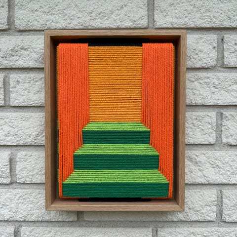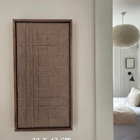 Taktilt værk i tråd, monteret i svæveramme af massivt egetræ. Garnkunst. Vikleværk.