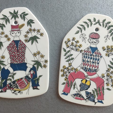 De er lavet ud fra norske folkeviser: “Ud efter øl” og “Per Spelmann”. De er alle fire i perfekt stand. De er super fine at hænge på væggen til den personlige stil.