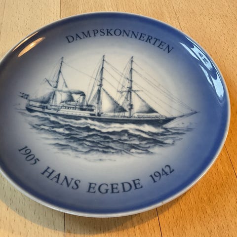Flot blå platte fra Royal Copenhagen med Hans Egede & Gertrud Rask - 1721 - 1971 som motiv.
