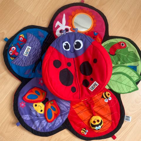 Babyen ligger på maven og kan dreje rundt og udforske alle de spændende ting på tæppet.