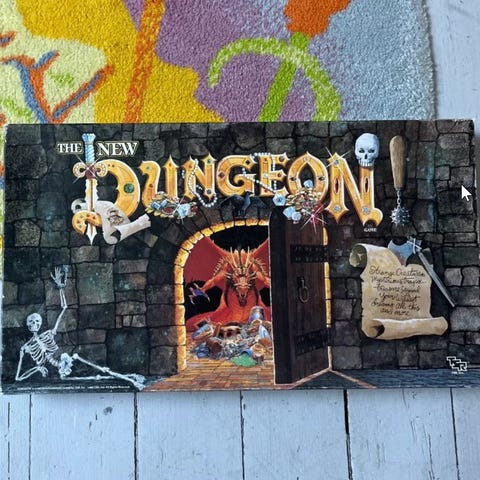 Of Dungeons Deep! brætspil med illustrationer af forskellige figurer og et eventyrtema. Spillet indeholder et spilbræt og spillekort, der bruges til rollespil og strategispil. Komplet. Sender ikke for køb under 200 kr.