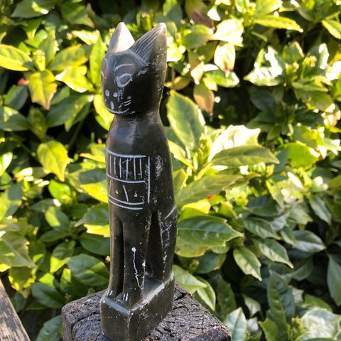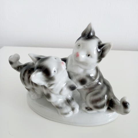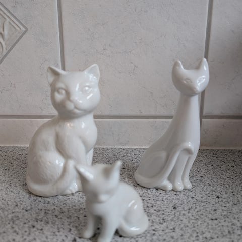 Katte I fedtsten hhv. Stribet og helt hvid. Den stribede er 21,5 cm høj, mens den hvide er 26,5 cm høj. Sælges samlet og som beset for 100 kr.