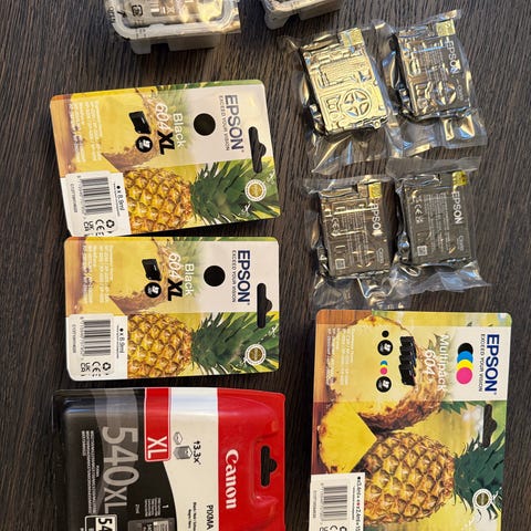 20 stk ass. Epson 18XL blækpatroner, heraf 2 hele sæt . Kompatible patroner, ikke originale. Helt nye og ubrugte. Nypris pr stk 51 kr hos landets største forhandler, i alt 980 kr. Køb til under 1/10 af prisen.