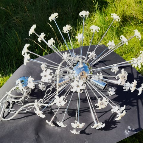 På grund af flytning sælger vi denne smukke loftlampe. Den er lavet i moderne stil (forkromet) og der er små akryl blomster på pinder som pynt. Lampen ville passe fint til en ung piges værelse. Den er tysk. Diameteren er ca 50cm Alle blomster er ens og er 4,5 cm store