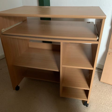 Kontorbord med integreret opbevaringsenhed og skuffesektion på hjul. Bordet har flere hylder og skabe til opbevaring, i en lys træ- og grå farvekombination. Egnet til kontorbrug eller hjemmekontor.
