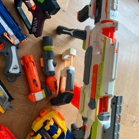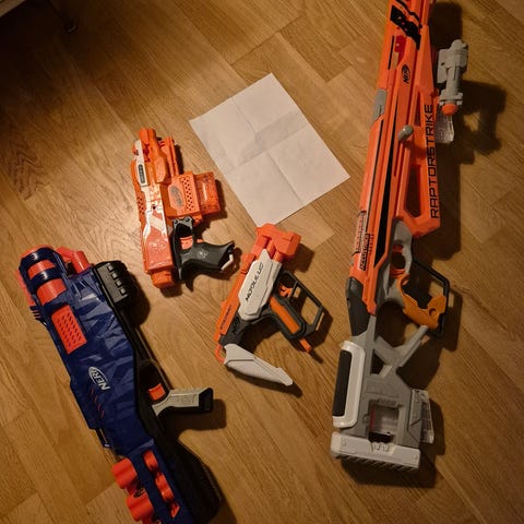 Flere forskellige nerf guns. 30 stk. skud samt målskive.