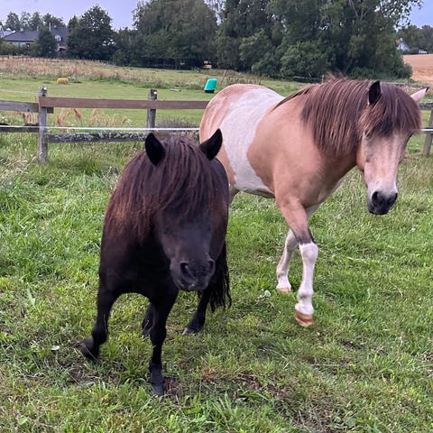 To dejlige shetlandsponyer sælges sammen. De er vant til børn, trafik og hunde m.m. Begge kan trækkes, strigles, løfte hove, stå/græsse i snor og har deltaget i ponyskole og skønhedssalon, hvor de har været ”øve-modeller” for børn, der har lært hvordan man omgås (små) heste. Har aldrig været redet på eller gået for vogn men vil være flotte sammen for en vogn.