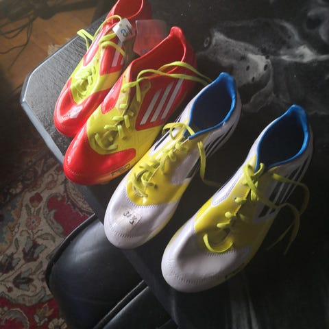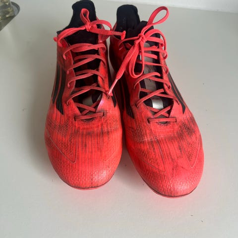 Adidas F50 fodboldstøvler i gul og rød farve. Designet til herre med letvægtsmateriale og knopper til optimal greb på banen. Støvlerne er beregnet til brug på græsbaner.