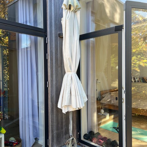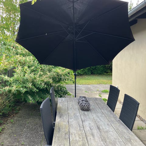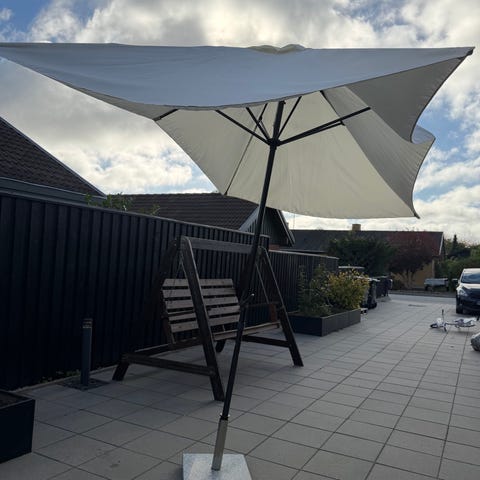 Hvid haveparasol med træstang, fod og stor diameter. Fungerer som den skal.