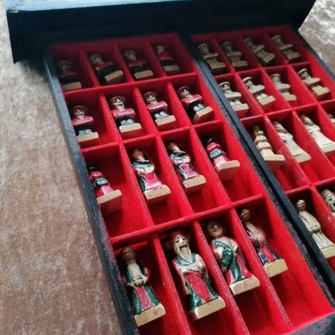 Skakspil, mest spillet i Vietnam og Japan. Flotte gibs eller porcelæns figurer, meget udtryksfulde. Figurene er i hel stand men holderene som figurerne ligger i er ikke pæne. Deraf prisen