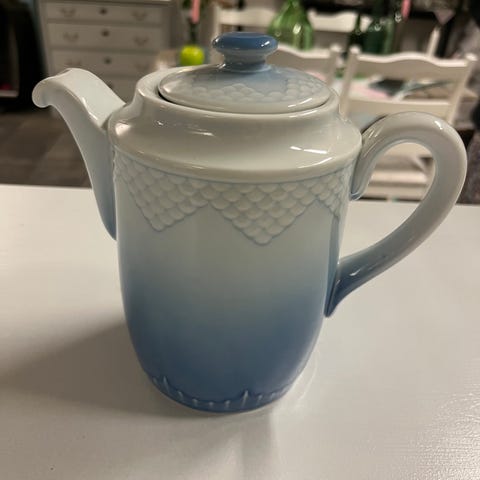 da den står og ikke bliver brugt tekanden har en rund form med låg og en lang tud. velegnet til brygning
