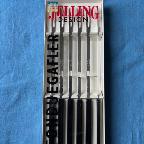 6 Mono Ring fonduegafler vist designet af Peter Raacke for Herbert Seibel i 1967. Har endda været solgt på MOMA i New York (altså jeg ved jo ikke, hvor netop dette sæt er købt 😊) Ligger i en pæn papæske (med lidt slid) Rustfrit stål med farvede håndtag i plastik. Længde 23,5 cm. Flot stand.