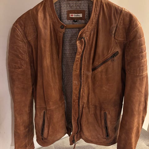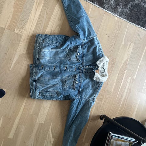- Jakken er fremstillet i denimmateriale og kraven i skind.
