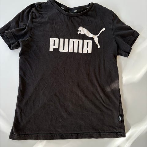 Puma børne t-shirt i hvid farve, størrelse 128, egnet til både drenge og piger. Fremstillet af bomuld med elastan, hvilket giver materiale med strækbarhed. T-shirten har et enkelt design med Puma-logo på fronten.