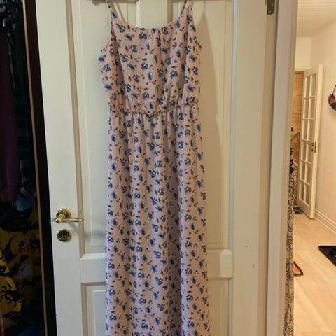 Lang skjortekjole, blåhvid blomstret, str. L, JDY = 60,-kr.