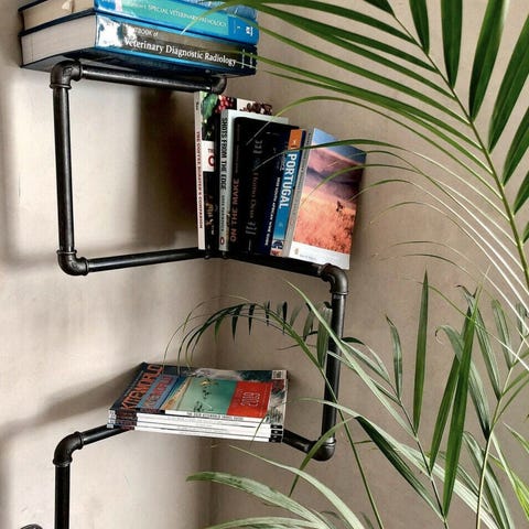 Flot vandrørsreol med 4 hylder. Hylderne kan justeres i højde.