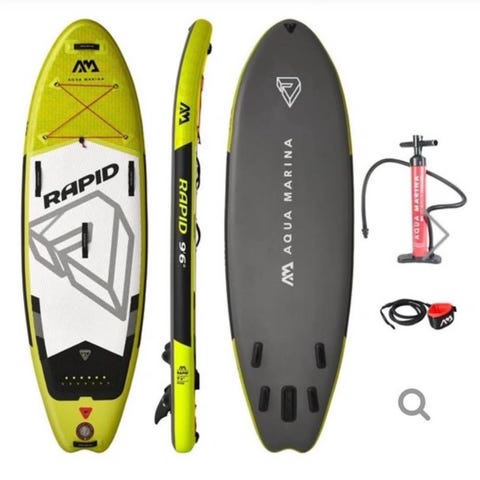 Aqua Marina Wave Stand Up Paddleboard med en længde på 10'6". Boardet har en sort og rød farvekombination og er fremstillet i holdbart materiale egnet til vandsport. Inkluderer pumpe, finner og tilbehør til oppustning og brug.