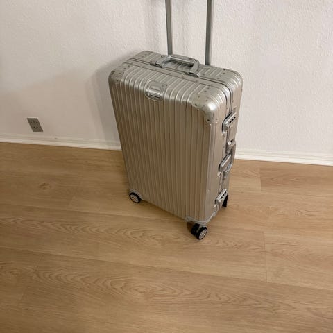 Den lille kuffert ved jeg ikke hvad mærke er men det er lige så god stand som Rimowa kufferten.