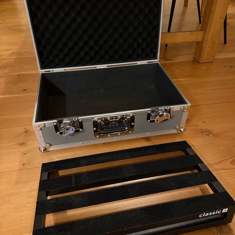 Mega fedt Pedalboard/pedalkasse/pedalkuffert. Låge slides til siden så det kan demonteres helt. Plads til mange pedaler. 230v udtag i kassen. Caline 5 power suply, Moen GEC 8 effects loop system samt en volume control medfølger.