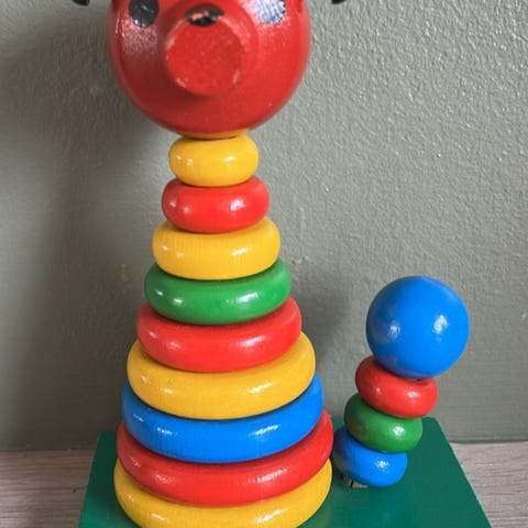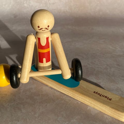 Sødt trælegetøj hvor man skal prøve at få den lille mand til at hænge fast i toppen, hvor der sidder en magnet.