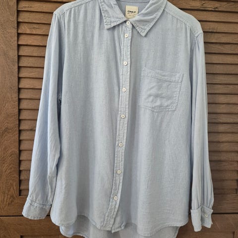 To ens hørskjorter, hvid og marineblå. Længde bagpå 71 cm, foran 68 cm. Brystmål. 106 cm. Ærmer kan smøges op med strop/knap. Brugt få gange. Sælges samlet for 475 kr, ellers 250 kr stykket. Ikke-ryger hjem. Sender gerne.