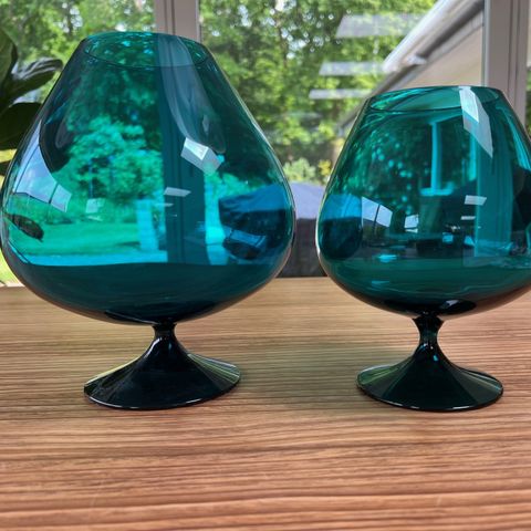 Stor vase / dekorationsglas / hurricane udformet som cognacglas. Med skøn petrol farvet kumme.