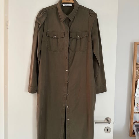 Armygrøn gennemknappet, ubrugt skjortekjole med 3/4 lange ærmer, lommer i siderne og slids forneden. Længde ca. 105 cm. Brystvidde ca. 100 cm. Ikke-ryger hjem. Sender gerne.