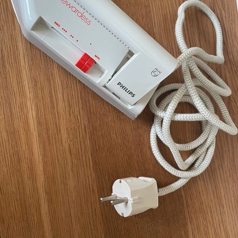 PHilips World Travel Iron HD1301-B Stewardess let og foldbar original etui og brugsanvisning. Justerbar temperatur, tabel med forskellige stoffer. L18xB7xH4,4 cm. (lot 2993)
