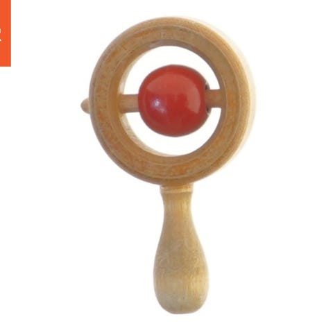 Trælegetøj med lyd, Haba, rangle, Fin farverig rangle. Der er klokker og spejl på den ene side så den kan rasle og barnet kan se sig selv. Gmb.