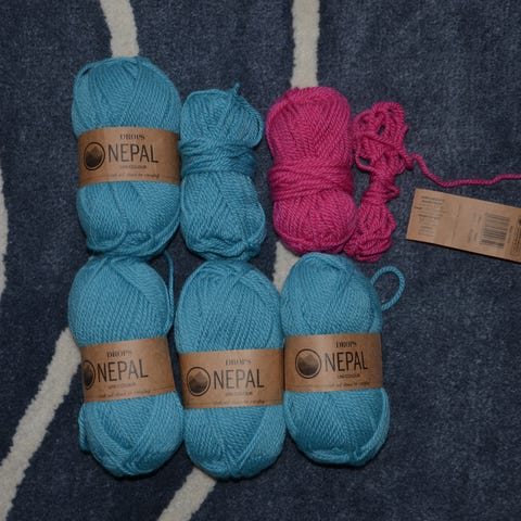 4 ngl. Drops Nepal garn (lidt af det ene nøgle har været brugt til en strikkeprøve).