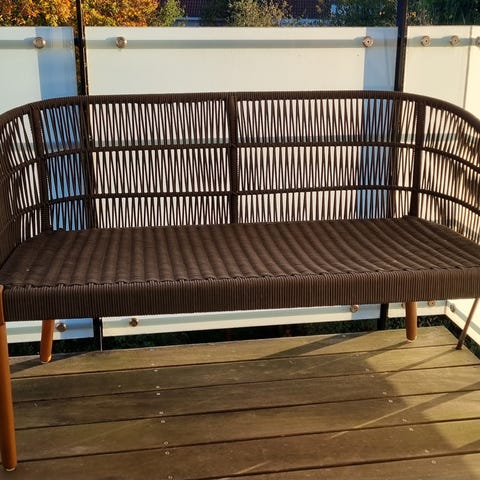 har denne polly rattan sofa 3 pers. den er velholdt hynderne har været på 2 gange og har kun været opbevaret indendørs. poserne til opbevaringsrum har ikke været brugt. gavlen kan bruges i begge ender sælges for 500,-