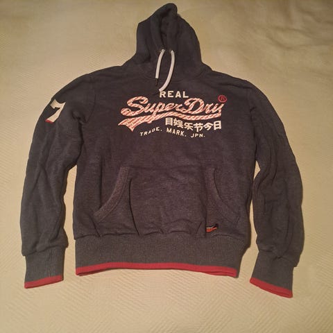 Superdry sort hættetrøje til mænd i størrelse XS. Hættetrøjen har snore i hætten og har lidt slidtage (se billeder), derfor den billige pris.