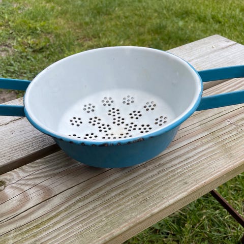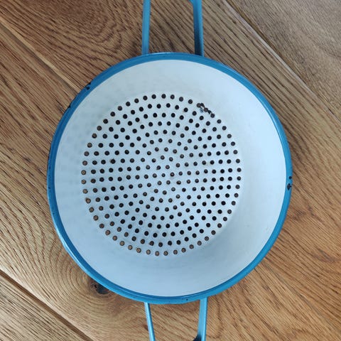 Dørslag, To blå emalje dørslag fra Madame Blå. De er I blå farve, selvfølgelig med brugsspor men stadig ganske velholdte.